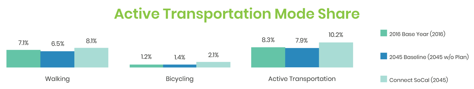 There are currently an estimated 4.7 million daily walking trips and 875,000 daily biking trips. This is expected to grow to 6.3 million daily walking and 1.7 million bicycling trips daily by 2045. Active transportation currently accounts for 8.3% of all trips taken in the SCAG region. Without Connect SoCal, that number would drop to 7.9%.