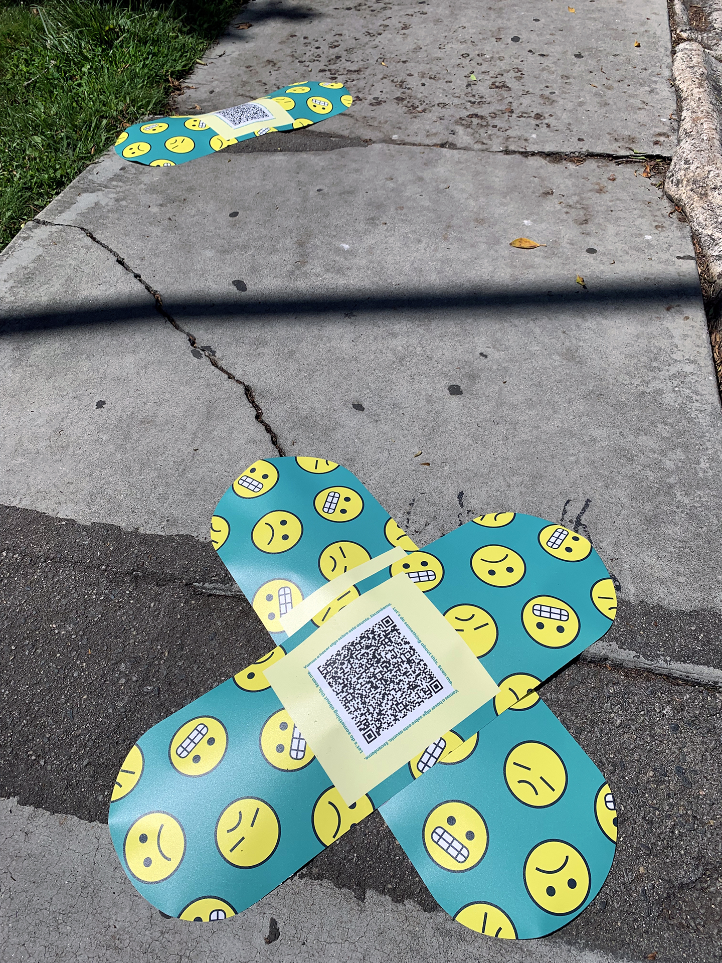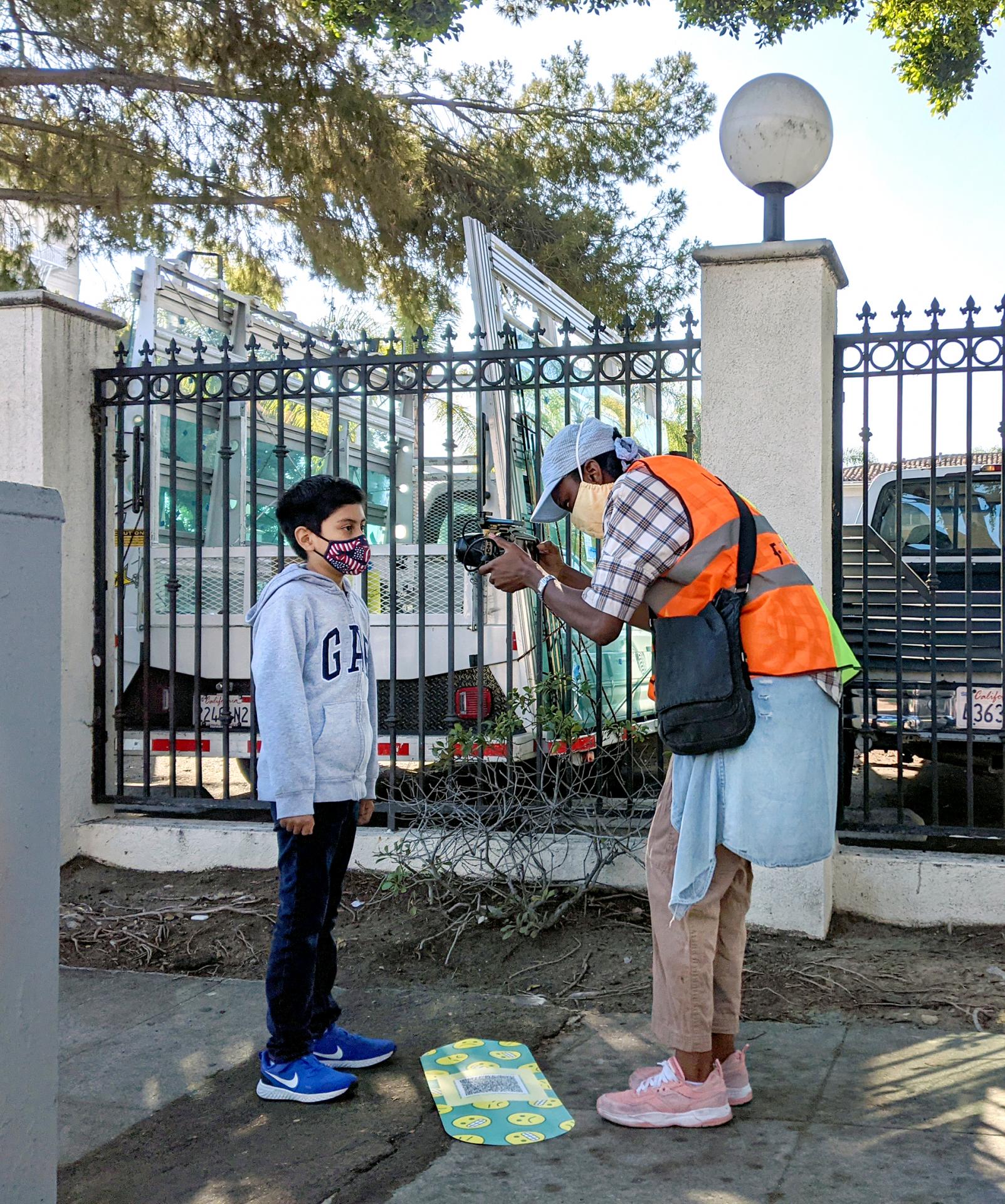 PM: For everyone’s safety, each media shoot was done outdoors and all members were physically distant. We directly engaged with parents and children on sidewalks, curbs, and crosswalks, using a combination of costumes, props, and band-aid stickers for the production of media assets. Bringing in community members’ previously identified priority concerns for each school, these activities set the foundation for co-created storylines, prop and costume making, and experimentation.